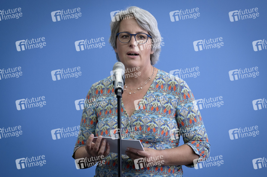 Kerstin Claus beim Pressestatement zum Gesetz zur Stärkung der Strukturen gegen sexuelle Gewalt an Kindern und Jugendlichen im Bundesfamilienministerium. Berlin, 02.07.2025