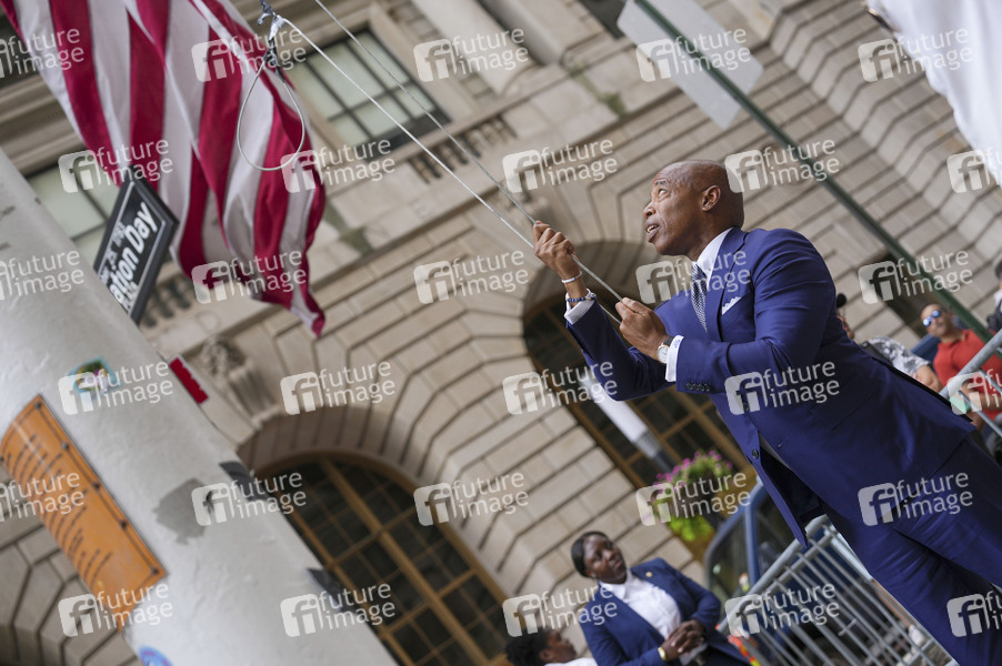 Eric Adams bei der Zeremonie zum Hissen der Flagge der Ukraine anlässlich des 31. Unabhängigkeitstages der Ukraine in Bowling Green. New York, 24.08.2022