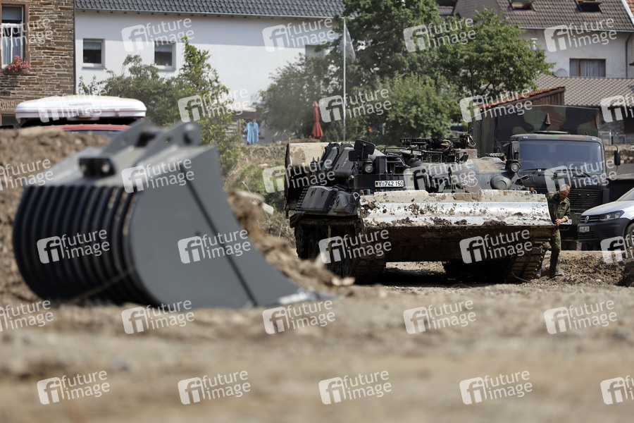 Nach dem Jahrhunderthochwasser in der Eifel durch heftige Regenfälle und Dauerregen mit Überschwemmungen und Überflutungen haben die Aufräumarbeiten im Ahrtal begonnen. Einheiten von Polizei, THW, Bundeswehr und Feuerwehr mitsamt vielen freiwilligen Helfern räumen Straßen, entfernen Schutt und Schlamm und versorgen die Menschen. Im Bild ein Räumpanzer in der Ortschaft Rech, in der die Flut viele Häuser zerstörte, 22.07.2021