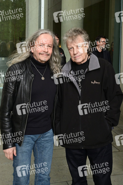 Peter 'Bimbo' Rasym und Dieter 'Quaster' Hertrampf von den Puhdys bei der Gedenkfeier für den verstorbenen Gitarristen von City, Fritz Puppel, im Krematoriumsgebäude Baumschulenweg. Berlin, 10.04.2024