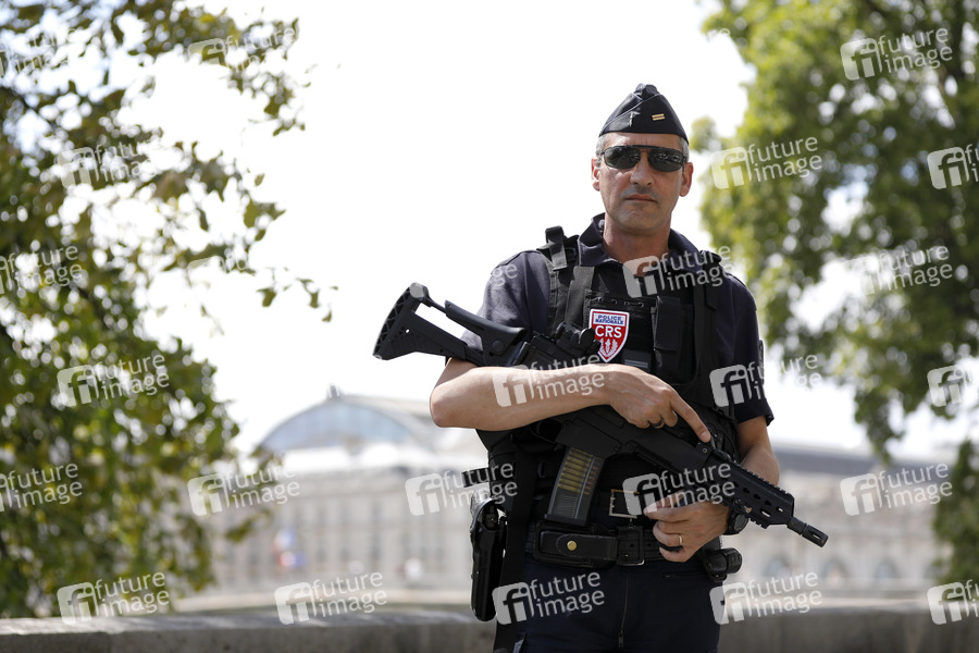 Tourismus, Touristen, Sightseeing, Stadt der Liebe, Architektur, Sommer in Paris, Reiseziel, Frankreich, Kultur, Polizei, Polizist, Polizistin, Polizisten, Pariser Polizei, französische Polizisten, Streife, innere Sicherheit, Sicherheitsmaßnahmen, Terrorabwehr, Terror-Gefahr, Nationalpolizei, CRS, Republikanische Sicherheitskompanien, Compagnies Républicaines de Sécurité, Police nationale, Nationalpolizei