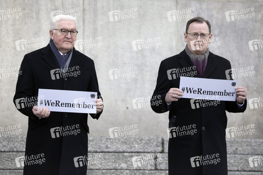 Frank-Walter Steinmeier und Bodo Ramelow nach der Gedenkstunde zum Tag des Gedenkens an die Opfer des Nationalsozialismus anlässlich des Jahrestages der Befreiung des NS-Vernichtungslagers Auschwitz im Deutschen Bundestag vor dem Reichstagsgebäude. Berlin, 27.01.2022