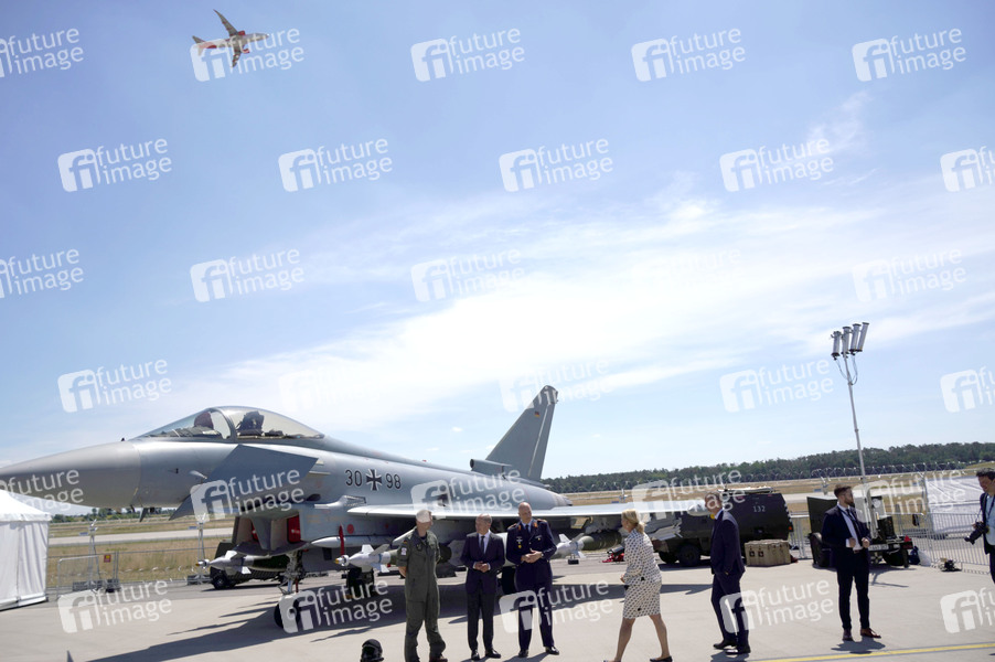Stefan Schneemilch, Olaf Scholz und Ingo Gerhartz vor einem Eurofighter bei der ILA-Eröffnung mit anschließendem Rundgang auf dem ILA-Gelände am Flughafen BER Berlin-Brandenburg. Berlin, 22.06.2022