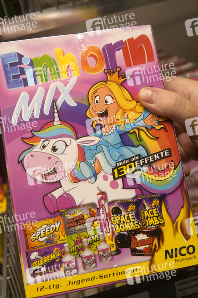 Ab Samstag den 28.12. ist der Verkauf von Feuerwerkskörpern 2024 erlaubt. Auch dieses Jahr wird eine große Nachfrage erwartet. Im Bild Einhorn-Mix im Blisterpack in einem Supermarkt. (Symbolfoto, Themenfoto) Berlin, 28.12.2024