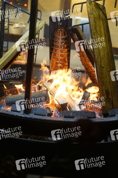 Lachs wird am offenen Feuer gegrillt auf dem Weihnachtsmarkt am Schloss Charlottenburg. Nach dem Anschlag auf dem Weihnachtsmarkt in Magdeburg hat die Polizei ihre Präsenz auf Weihnachtsmärkten in Berlin und Brandenburg verstärkt. .Berlin, 22.12.2024