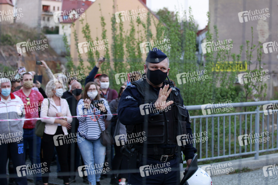Demonstranten protestieren gegen die geschlossene Grenze zwischen Zgorzelec und Görlitz. Zur Eindämmung des Coronaviruses haben unter anderem Polen und Tschechien Mitte März die Grenzen nach Deutschland geschlossen. Hintergrund des Protestes sind die aktuellen Einschränkungen für Arbeiter, die normalerweise täglich nach Deutschland pendeln, jetzt aber nach Wiedereinreise nach Polen in zweiwöchige Quarantäne müssten. Außerdem sind grenzübergreifende, familiäre Kontakte durch die geschlossenen Grenzen nahezu ausgeschlossen. Görlitz, 24.04.2020