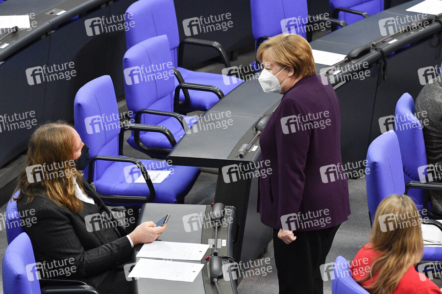 Anton Hofreiter und Angela Merkel in der 205. Sitzung des Deutschen Bundestages im Reichstagsgebäude. Berlin, 27.01.2021