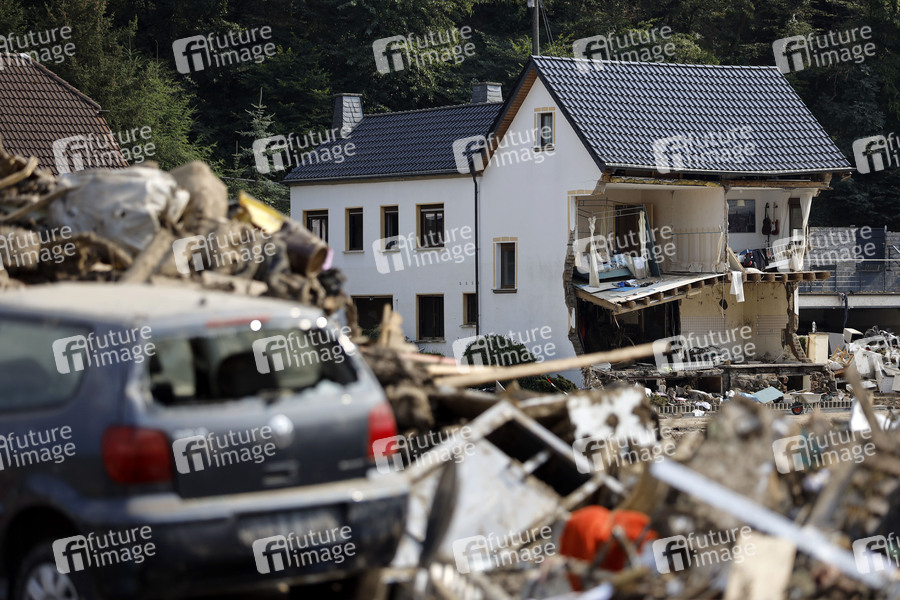 Nach dem Jahrhunderthochwasser in der Eifel durch heftige Regenfälle und Dauerregen mit Überschwemmungen und Überflutungen haben die Aufräumarbeiten im Ahrtal begonnen. Einheiten von Polizei, THW, Bundeswehr und Feuerwehr mitsamt vielen freiwilligen Helfern räumen Straßen, entfernen Schutt und Schlamm und versorgen die Menschen. Im Bild zerstörte Häuser an der Uferpromenade in der Ortschaft Dernau, in der die Flut viele Häuser zerstörte, 22.07.2021