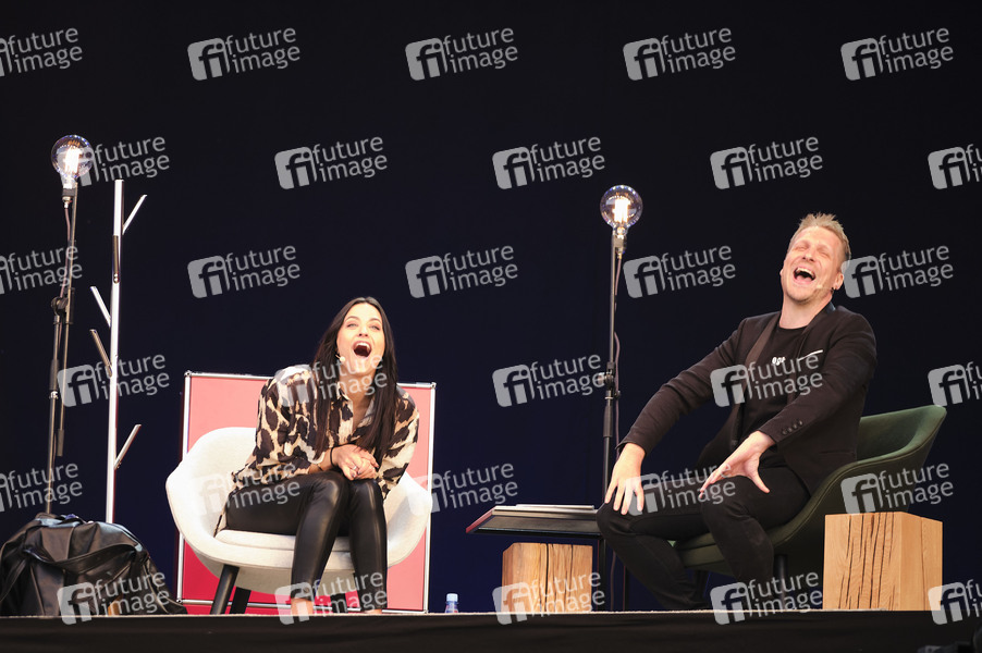 Oliver Pocher mit Ehefrau Amira Pocher bei der ersten Autokultur-Veranstaltung 'Die Pochers hier' auf dem Schützenplatz. Die Besucher verfolgen unter Berücksichtigung klarer Hygiene-Vorschriften während der Corona-Krise den Auftritt aus dem Auto. Hannover, 07.05.2020
