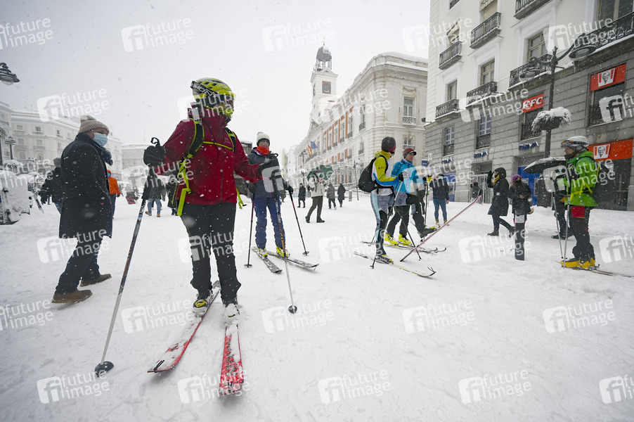Skifahrer auf dem Puerta del Sol - Das Sturmtief Filomena sorgt in der Region Madrid und anderen Teilen Spaniens mit starken Schneefällen für Chaos. Die Hauptstadt Madrid wurde durch historisch heftigen Schneefall lahmgelegt. Seit 50 Jahren hat es nicht so geschneit. Der Verkehr ist in weiten Teilen des Landes zusammengebrochen. Madrid, 09.01.2021