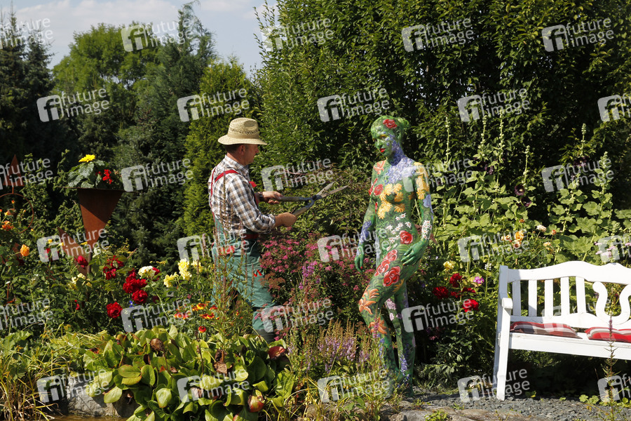 Garten-Bodypainting mit Model Denise als Blumenbeet und Gärtner Klaus von der Gärtnerei Ahlschwede-Roske als Teil des Projekts 'Working Art' des Künstlers Jörg Düsterwald und des Fotografen Tschiponnique Skupin, in dem sie Menschen per Bodypainting in klassischen Berufssituationen zeigen. Bad Münder, 19.07.2014