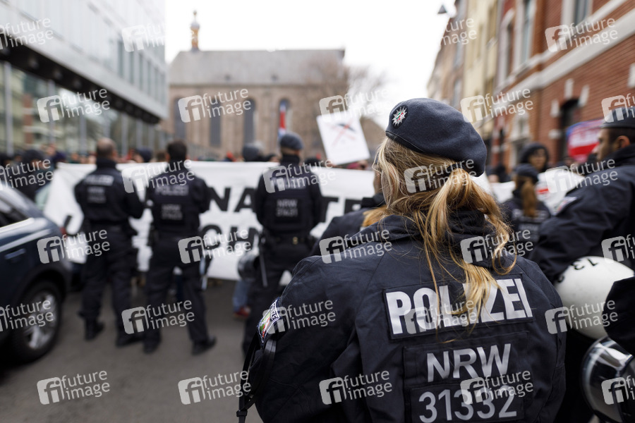 Polizisten schützen Demonstranten gegen den WDR bei den Protesten gegen das von einem Kinderchor gesungene Satire-Lied 'Meine Oma ist ne alte Umweltsau' von WDR2 am WDR Gebäude in der Breite Straße. Köln, 04.01.2020