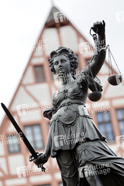 Die Justitia auf dem Gerechtigkeitsbrunnen auf dem Römerberg. Justitia stand in der römischen Mythologie für die ausgleichende Gerechtigkeit und steht in der Neuzeit für die strafende Gerechtigkeit oder das Rechtswesen an sich. (Themenbild, Symbolbild) Frankfurt am Main, 16.05.2021
