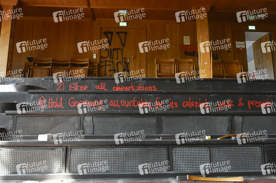 Nach einer Besetzung des Emil-Fischer-Saals der Humboldt-Universität durch propalästinensische Aktivisten die durch die Polizei geräumt wurde, sind offenbar so umfangreiche Schäden entstanden, dass der Raum nicht mehr nutzbar ist. Berlin, 22.04.2025