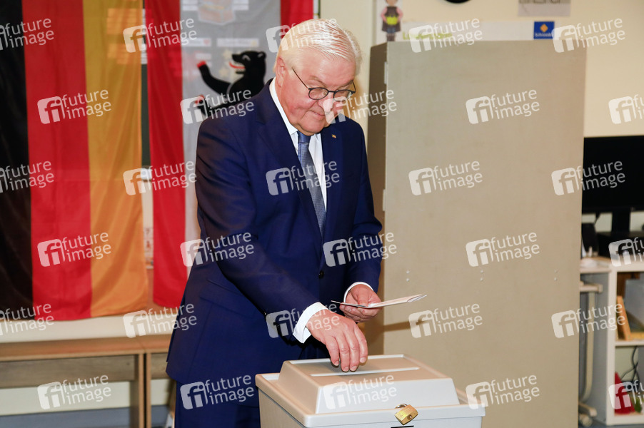Frank-Walter Steinmeier bei der Stimmabgabe zur Bundestagswahl im Wahllokal in der Erich-Kästner-Grundschule in Berlin-Zehlendorf. Berlin, 23.02.2025