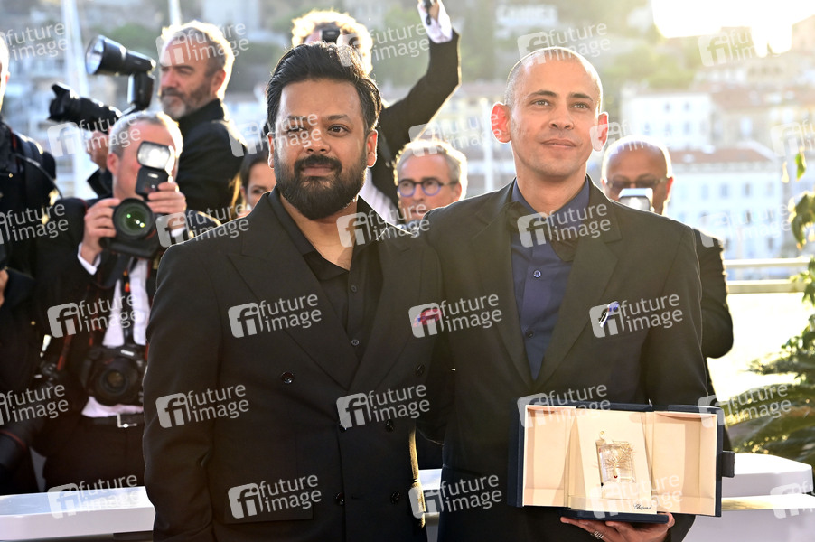 Adnan Al Rajeev und Tawfeek Barhom mit der Goldenen Palem für den besten Kurzfilm 'I'm Glad You're Dead Now' beim Photocall mit den Preisträgern auf dem Festival de Cannes 2025 / 78. Internationale Filmfestspiele von Cannes am Palais des Festivals. Cannes, 24.05.2025