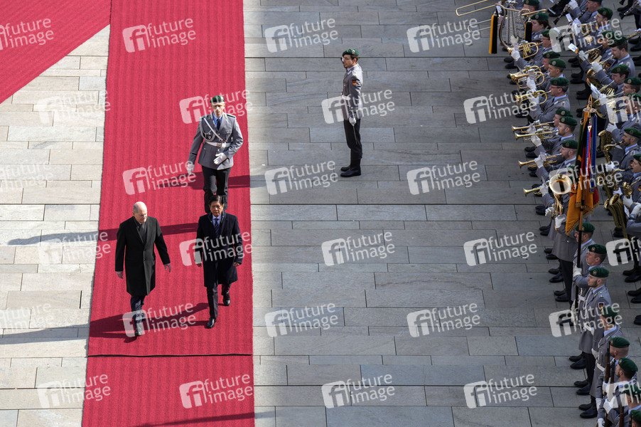 Olaf Scholz und Ferdinand Marcos Jr. beim Empfang des Staatspräsidenten der Republik der Philippinen mit militärischen Ehren und zu einem gemeinsamen Gespräch mit dem Bundeskanzler und anschließendem Pressestatement im Bundeskanzleramt. Berlin, 12.03.2024