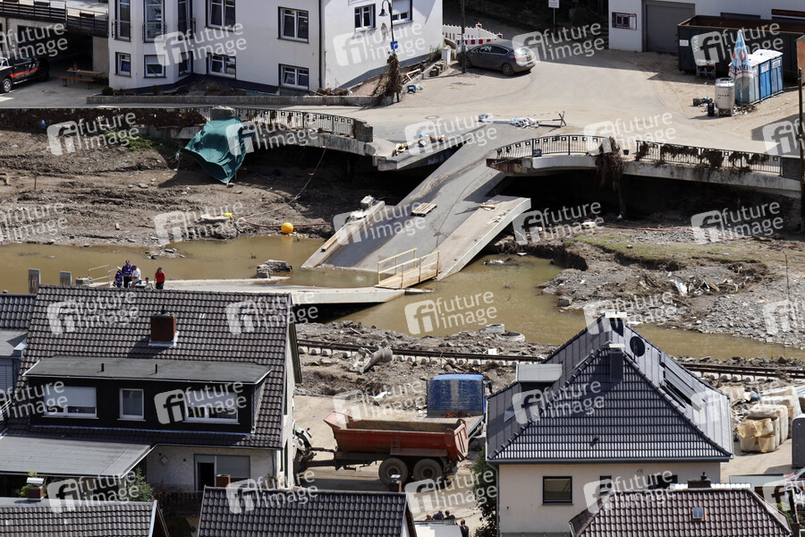 Nach dem Jahrhunderthochwasser in der Eifel durch heftige Regenfälle und Dauerregen mit Überschwemmungen und Überflutungen haben die Aufräumarbeiten im Ahrtal große Fortschritte gemacht. Einheiten von Polizei, THW, Bundeswehr und Feuerwehr mitsamt vielen freiwilligen Helfern haben Straßen geräumt, Schutt und Schlamm entfernt und die Menschen versorgt. Der Wiederaufbau wird trotzdem Jahre dauern. Im Bild Flutschäden in der Ortschaft Dernau, in der die Flut viele Häuser zerstörte, 08.08.2021