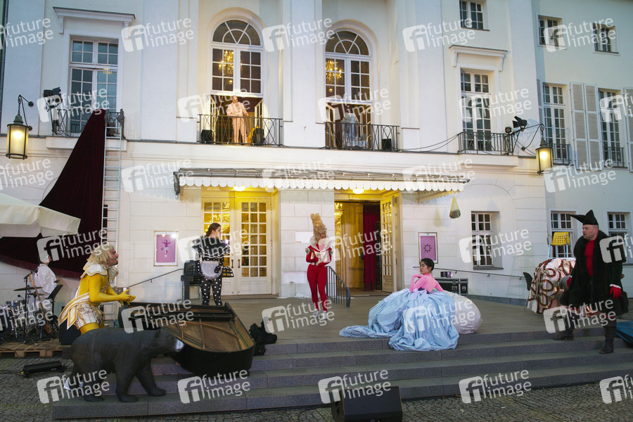 Carolina Bigge, Tamer Tahan, Linn Reusse, Natali Seelig, Kotbong Yang und Felix Goeser bei der Fotoprobe des Theaterstücks 'Tartuffe oder Das Schwein der Weisen' Open Air auf dem Vorplatz des Deutschen Theaters. Berlin, 17.05.2021