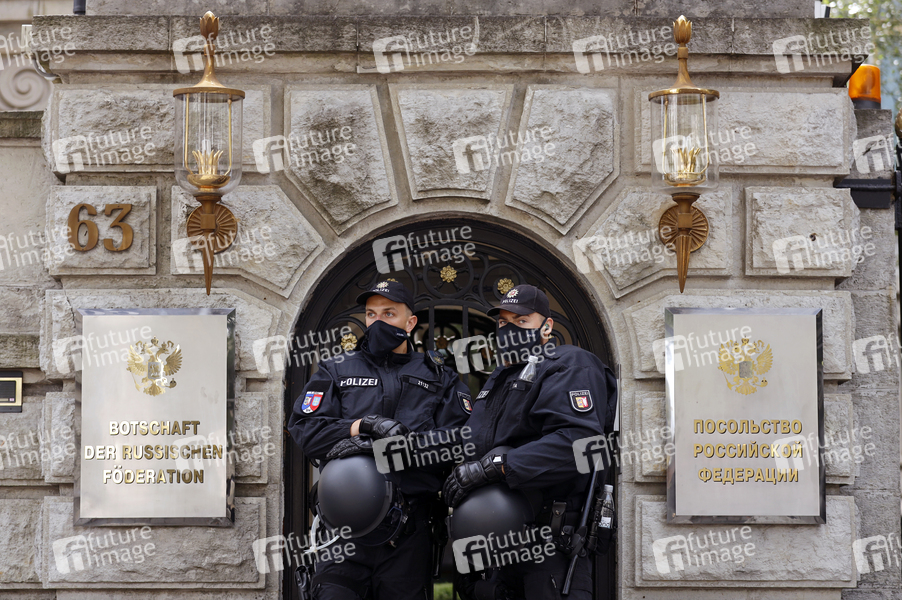 Im Bild die Demo vor der russischen Botschaft. Demonstranten verschiedener Gruppierungen wie etwa der Initiative Querdenken 711 protestierten mit einer Großdemonstration in Berlin gegen die bestehenden Maßnahmen zur Eindämmung der Corona-Pandemie. Wegen Nichteinhaltung der polizeilichen Auflagen wurde die Demonstration durch die Polizei beendet. Es gab Rangeleien und Festnahmen. Berlin, 29.08.2020