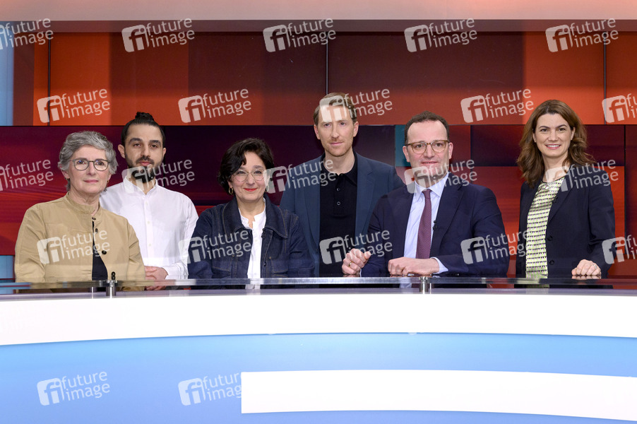Britta Haßelmann, Tareq Alaows, Isabel Schayani, Louis Klamroth, Jens Spahn und Tanja Schweiger in der ARD-Talkshow 'hart aber fair' im WDR Fernsehstudio B. Köln, 06.03.2023
