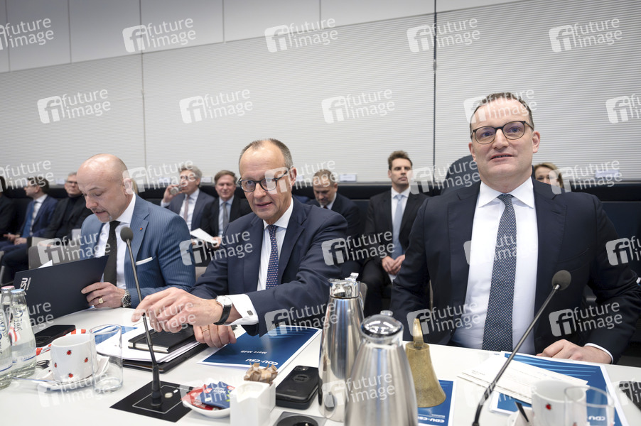 Alexander Hoffmann, Friedrich Merz und Jens Spahn in der Fraktionssitzung der CDU/CSU-Bundestagsfraktion im Reichstagsgebäude. Berlin, 27.01.2026