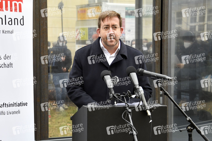 Christian Mihr bei der Pressekonferenz des KulturForum TürkeiDeutschland zur Solidarität mit den gesamten demokratischen Kräften in der Türkei, insbesondere mit inhaftierten Schriftsteller*innen, Künstler*innen, Journalist*innen, Gewerkschafter*innen und Politiker*innen vor dem Maxim Gorki Theater. Berlin, 23.03.2021