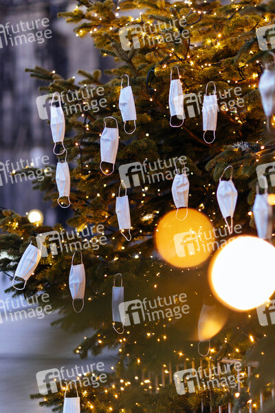 Gesichtsmasken hängen an den Weihnachtsbäumen auf dem Roncalliplatz. Normalerweise wird der Platz als Standort für einen der umsatzstärksten Weihnachtsmärkte der Region genutzt. Aufgrund der Corona-Pandemie wurde dieser ersatzlos gestrichen. (Themenbild, Symbolbild) Köln, 11.12.2020