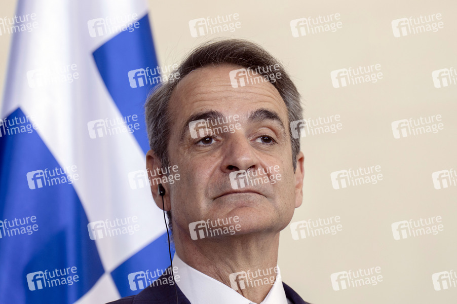Kyriakos Mitsotakis beim Empfang des Ministerpräsidenten von Griechenland mit militärischen Ehren und zu einem gemeinsamen Gespräch mit dem Bundeskanzler mit anschließendem Pressestatement im Bundeskanzleramt. Berlin, 13.05.2025