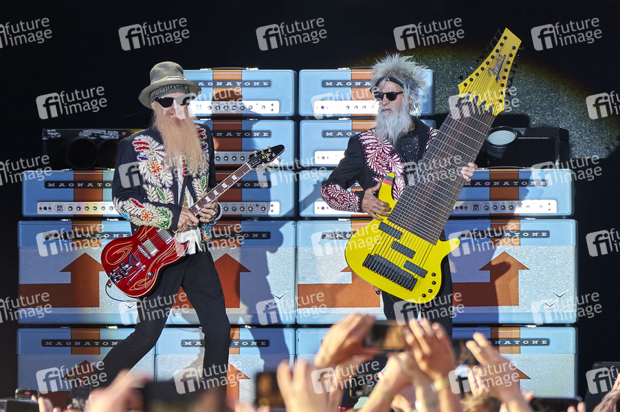 Billy Gibbons und Elwood Francis von ZZ Top live beim Sommerfestival 2024 unter dem Motto 'Beats, Bands und Beach' in der Autostadt. Wolfsburg, 13.07.2024