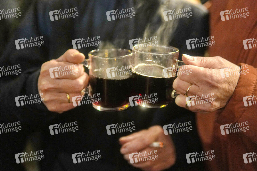 Zwei Gläser Glühwein in der Hand auf dem Lucia Weihnachtsmarkt in der Kulturbrauerei. Berlin, 21.12.2024