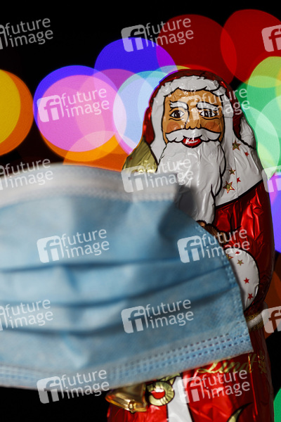 Schoko-Weihnachtsmänn von Lindt halten eine Gesichtsmaske. Im Hintergrund eine Lichterkette. (Themenbild, Symbolbild) Köln, 19.11.2020