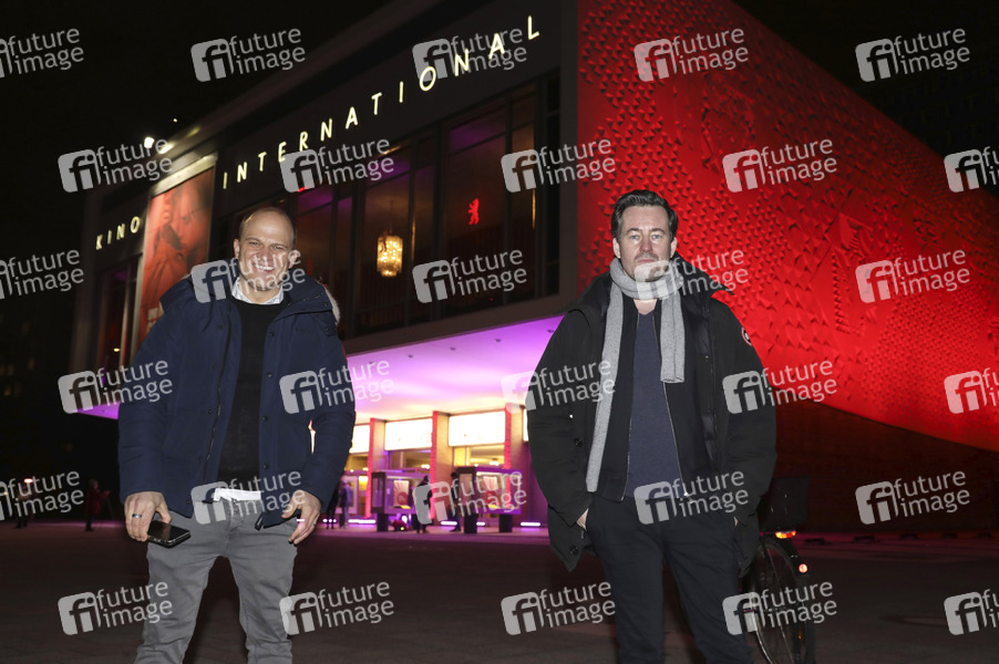 Christian Bräuer, Vorstand der AG Kino, und Christian Schwochow vor dem Kino International bei der Aktion 'Kino leuchtet. Für dich.' anlässlich der nur für die Fachwelt virtuell stattfindenden Berlinale und im Hinblick auf die Beratungen der Regierungschef:innen von Bund und Ländern über den Stufenplan zur Wiedereröffnung mit Blick auf die immer noch geschlossenen Kulturorte. Berlin, 28.02.2021