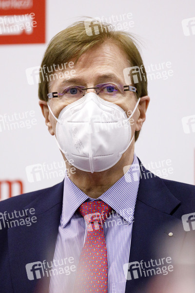 Peter Biesenbach auf der Pressekonferenz: Der NRW-Justizminister auf Werbetour in Köln für die Kampagne des Weissen Rings zum Thema 'Kein Anschluss für Betrüger am Telefon' im Impfzentrum in den Messehallen. Auch dort sollen Plakate die alten Menschen vor der Enkeltrick-Masche warnen, die ohnehin die Messehallen für einen Impftermin aufsuchen. Köln, 05.02.2021