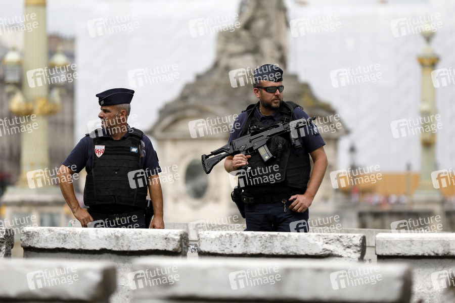 Einheiten der Nationalpolizei (CRS) patroillieren mit schweren Waffen in Paris. Paris, 29.07.2019