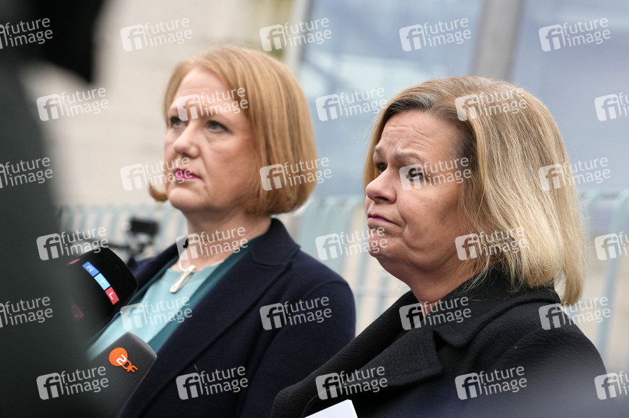 Lisa Paus und Nancy Faeser bei einer Pressekonferenz zum Nationalen Aktionsplan gegen Menschenhandel und Gewaltstrategien vor dem Bundeskanzleramt. Berlin, 11.12.2024