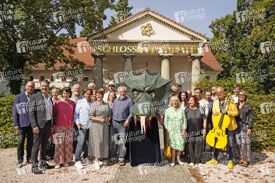 Johannes Hallervorden, Hardy Krüger jr., Irene Christ, Janina Hartwig, Frank Kessler, Dieter Landuris, Folke Braband, Sabine Fürst, Gayle Tufts, Philip Tiedemann, Marten Sand, Nathalie Hallervorden, Dieter Hallervorden, Dagmar Biener, Gesine Sand, Helen Barke, Brigitte Grothum, Claudio Maniscalco, Fabian Stromberger, Marko Pustisek, Tonio Arango, Thomas Schmidt-Ott, Marc Laade und Caroline Beil bei der Jahres-Pressekonferenz zur 16. Spielzeit 2024/2025 im Schlosspark Theater. Berlin, 03.09.2024