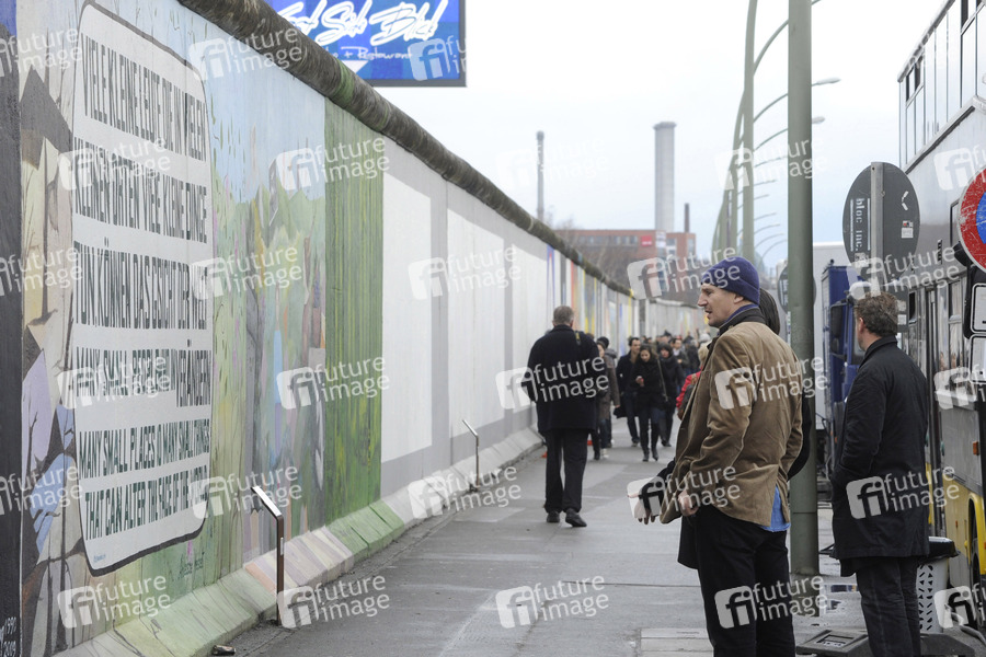 Liam Neeson besucht die Berliner Mauer an der East Side Gallery während einer Drehpause zu seinem Thriller 'Unknown Identity'