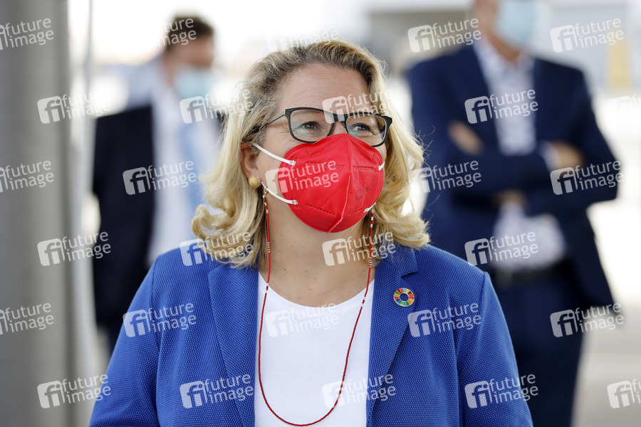 Svenja Schulze beim Besuch von Umweltministerin Svenja Schulze und NRW-Verkehrsminister Hendrik Wüst bei der KVB Köln mit symbolischer Inbetriebnahme der neuen Ladeinfrastruktur für Elektro-Busse. Köln, 29.06.2021