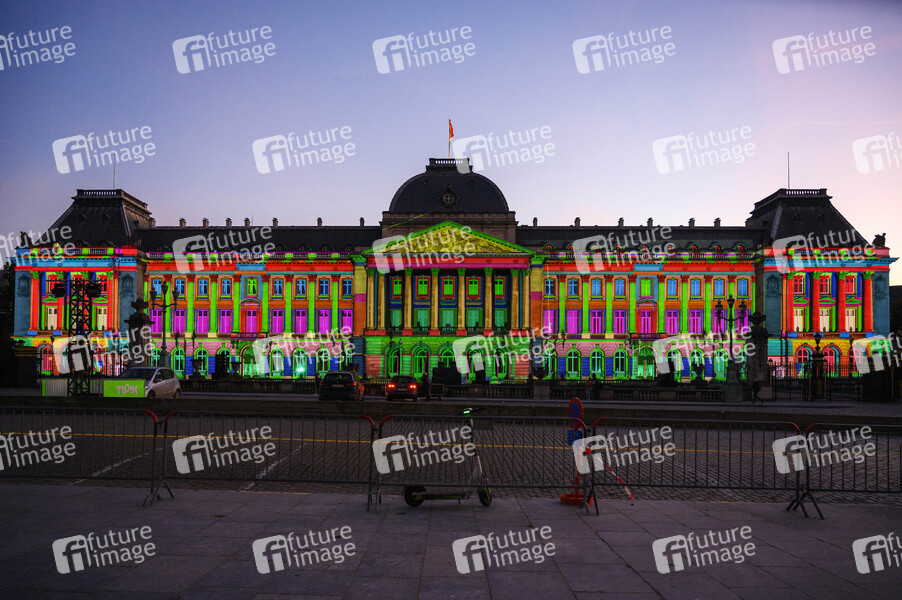 Der Königliche Palast beleuchtet mit bder Videokunst Performance 'Chiaroscuro - Dirty Monitor' im Rahmen des Events 'Bright Brussels'. Brüssel, 27.10.2021