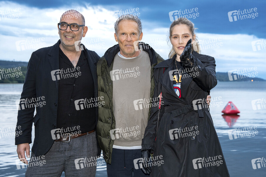 Hannes Ringelstetter, Christian Tramitz und Mitsou Jung bei der Premiere von zwei neuen Folgen der ARD-Vorabendserie 'Hubert ohne Staller' auf dem Open Air Starnberg 2025 im Open Air Kino im Seebad. Starnberg, 05.08.2025