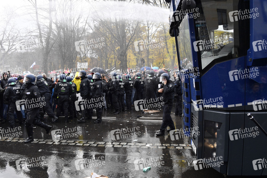 Tausende Demonstranten protestieren am Brandenburger Tor und im Regierungsviertel gegen die Corona-Politik der Regierung. Wegen der massenhaften Verstöße gegen die Hygieneauflagen hat die Polizei die Proteste unter Einsatz von Wasserwerfern beendet. Berlin, 18.11.2020