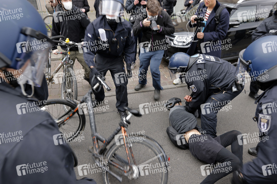 Protest, Demo, Demonstration, Corona-Maßnahmen-Kritiker, Corona-Hygieneregeln, Distanz, Mund-Nasen-Schutz, Protestierende, Demonstranten, Polizei, Polizisten, Gegner der Corona-Maßnahmen, Infektionsschutzgesetz, Corona-Notbremse, Eindämmung der dritten Pandemiewelle, Coronaleugner, Teilnehmer, Corona-Regeln, Pandemie, Corona-Demo, Coronademo, Querdenker, Querdenken, Gegendemonstranten, Corona-Leugner, Demo gegen Lockdown