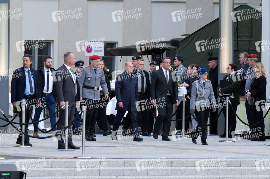 Carsten Breuer, Olaf Scholz und Boris Pistorius bei der Würdigung der Mali-Einsätze mit zentralen Abschlussappell und einer Serenade mit allen deutschen Kontingentführern, internationalen Gästen sowie Angehörigen und Hinterbliebenen von deutschen Einsatzsoldaten, die in Mali gedient haben, auf dem Paradeplatz des Bundesministeriums der Verteidigung. Berlin, 11.04.2024