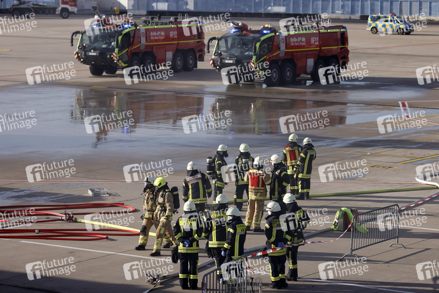 Einsatzkräftei der gemeinsamen ICAO-Notfallübung der Werkfeuerwehr, der Feuerwehr Köln, THW, Landespolizei, Bundespolizei und Bundeswehr am Köln Bonn Airport. Im Rahmen der Übung wird die Kollision eines Flugzeugs mit einem Passagierbus und einer Abfertigungshalle simuliert. Einsatzkräfte retten Verletzte aus dem in Brand geratenen Flugzeug. Köln, 06.11.2021