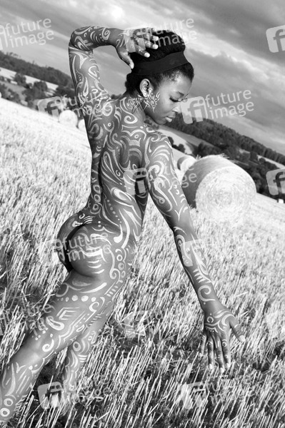 Bodypainting, Erotik, Frau, Mädchen, Afrikanerien, nackt, draußen, weiblich, Körperkunst, Kunst, Ornamente, Malerei, Feld, Acker, Stoppelfeld, Heuballen, Stroh, Landwirtschaft, Ernte, Abendsonne, erotic, African woman, girl, nude, outdoor, female, body art, body painting, ornaments, field, hay, straw, farming, harvest, evening sun