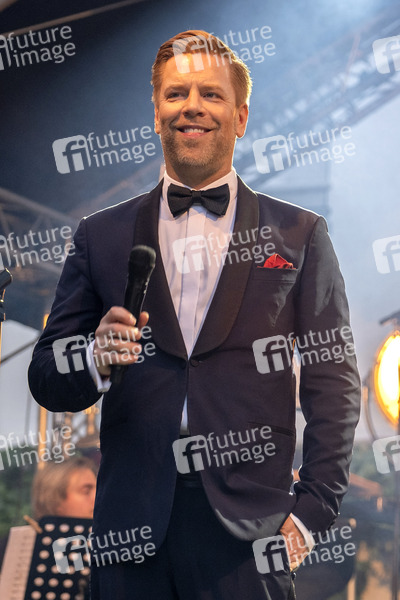 Tom Gaebel mit der Lumberjack Swing-Band unter der Leitung von Alexander Eissele live bei einem Konzert auf Schloss Filseck. Uhingen, 13.07.2024