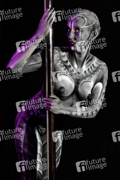 Bodypainting, Erotik, Frau, nackt, drinnen, weiblich, Monster, Außerirdische, Alien, Echse, Körperkunst, Kunst, Malerei, monochrom, erotic, woman, nude, indoor, female, monochrome, lizard, body art, body painting