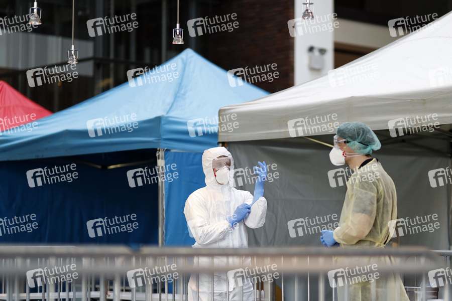 Die Stadt Köln hat ein drittes Infektionsschutzzentrum mit Mitarbeitern der Kölner Feuerwehr in Betrieb genommen, wo sich Bürger auf Covid-19 testen lassen können. Köln, 01.04.2020