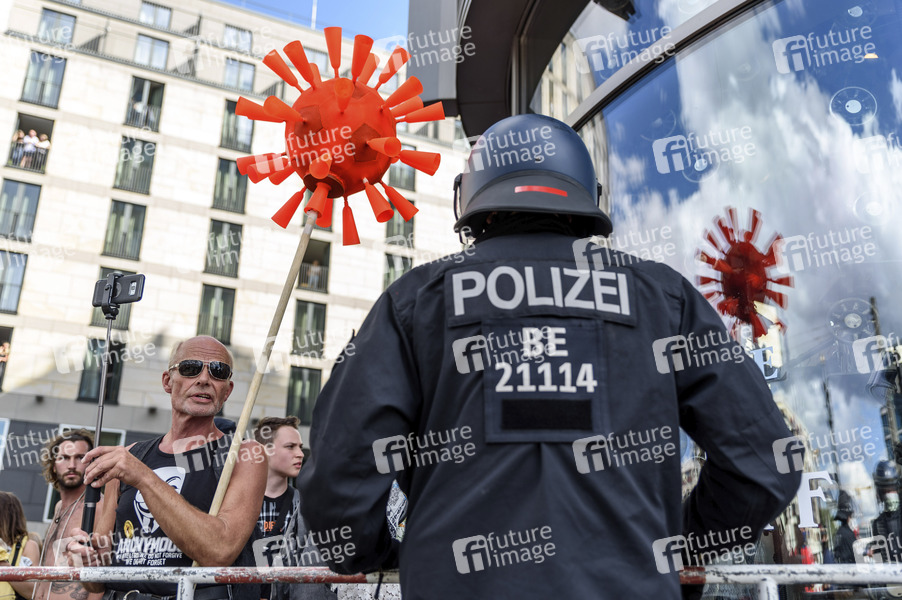 Coronaleugner, Verschwörungstheoretiker und rechte Gruppen der Initiative Querdenken protestieren mit einer Großdemonstration gegen die bestehenden Maßnahmen zur Eindämmung der Corona-Pandemie. Wegen Nichteinhaltung der polizeilichen Auflagen wurde die Demonstration durch die Polizei beendet. Berlin, 29.08.2020
